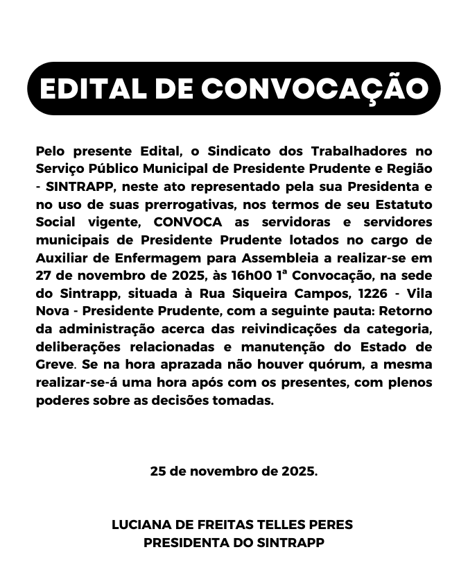 Edital – Assembleia com Auxiliares de Enfermagem de Prudente (27.11.25)