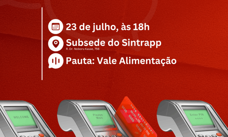 Na quarta-feira, 23 de julho, às 18h, o Sintrapp realiza reunião na subsede de Mirante com foco no vale-alimentação.
