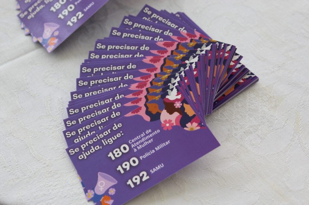 Logo na chegada, as participantes receberam cartões com números de emergência e canais de denúncia, reforçando a importância da informação e do acesso rápido aos serviços de proteção para mulheres que enfrentam situações de violência.