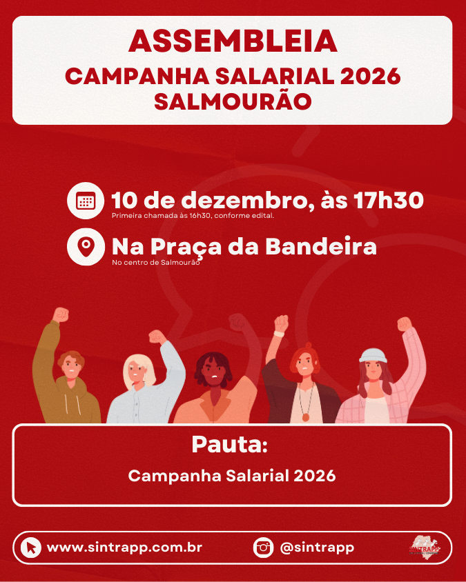 A participação de cada servidora e servidor de Salmourão é decisiva para fortalecer a Campanha Salarial de 2026. É na assembleia que a categoria define, coletivamente, quais serão as principais reivindicações do ano. Quando as servidoras e servidores se mobilizam, ganham voz por meio de suas reivindicações. Participar da assembleia é estar na defesa de direitos, lutar por valorização e mostrar que ninguém solta a mão de ninguém na luta!